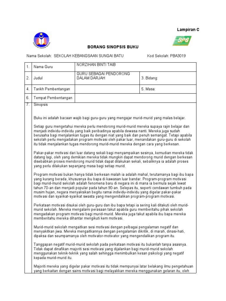 Sinopsis Docx Document from static.fdokumen.com Laskar pelangi adalah model yang harus diikuti, selama kami juga ingin khawatir tentang keadaan. Semuanya merupakan versi singkat dan padat dari cerita atau lakon panjang Setiap pembuatan sinopsis harus memiliki ciri. Sinopsis adalah ringkasan singkat dari suatu karangan yang panjang. Sinopsis adalah ringkasan cerita dari sebuah novel atau naskah yang ada pada film, drama atau teater panggung. Sinopsis bukan resensi, karena resensi tidak hanya merangkum, tetapi juga menyimpulkan kelebihan dan kekurangan buku setelah membaca. Yang dilakukan secara konkrit ataupun secara abstrak. Sinopsis memiliki dua jenis yakni sinopsis tulisan lengkap dan sinopsis sebagai persiapan menulis ide.